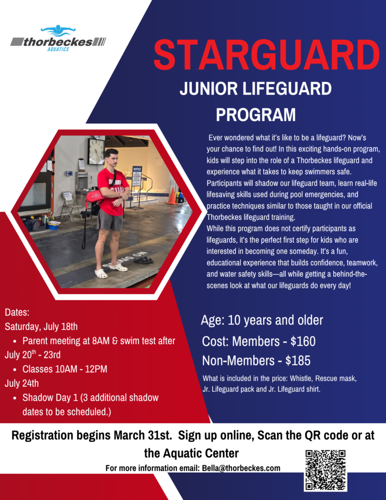 Ever wondered what it’s like to be a lifeguard? Now’s your chance to find out! In this exciting hands-on program, kids will step into the role of a Thorbeckes lifeguard and experience what it takes to keep swimmers safe. Participants will shadow our lifeguard team, learn real-life lifesaving skills used during pool emergencies, and practice techniques similar to those taught in our official Thorbeckes lifeguard training.